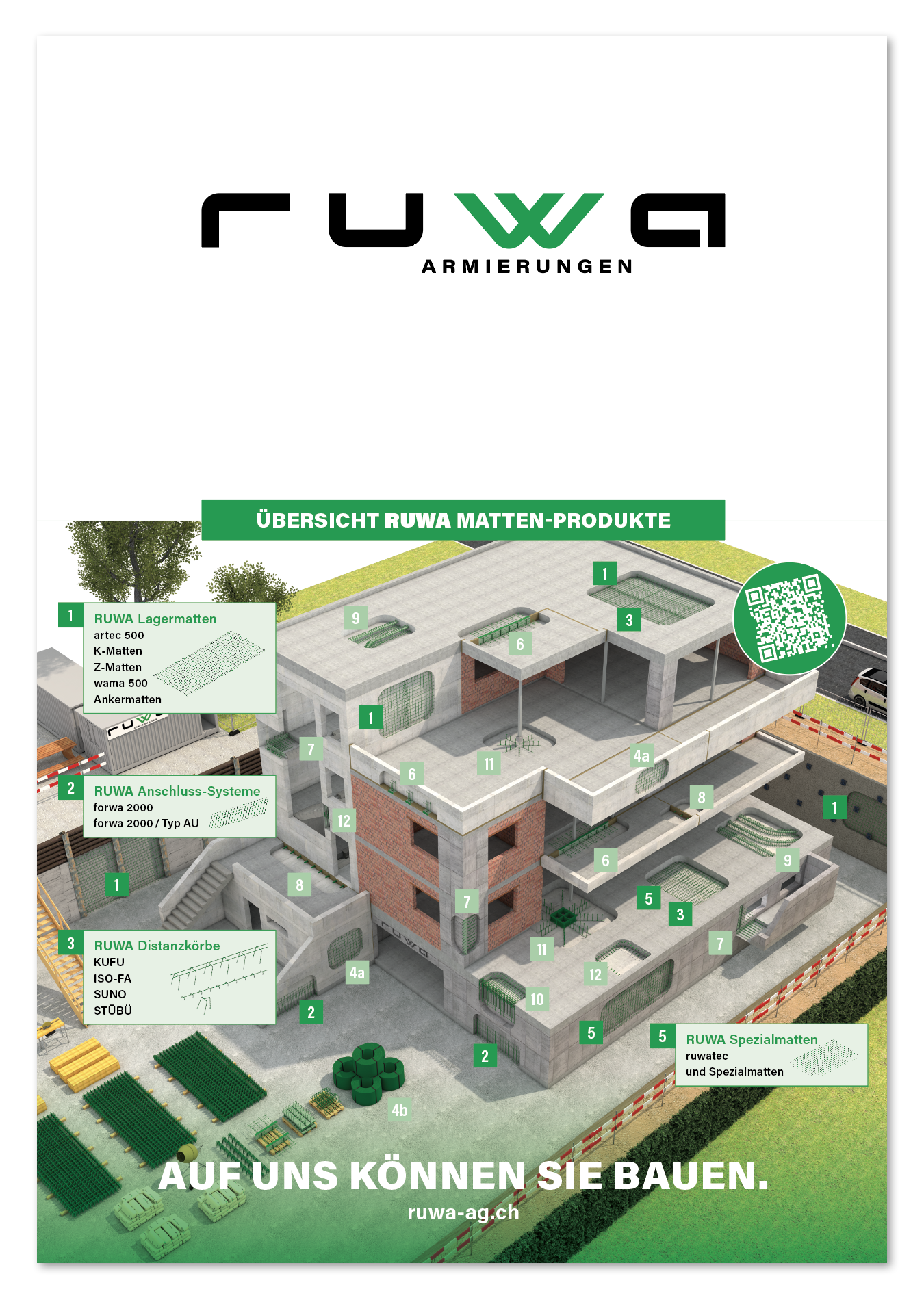 Bewehrungen sind unsere grosse Leidenschaft: Eine rasche Verfügbarkeit von qualitativ hochwertigem Bewehrungsmaterial ist erfolgsentscheidend. Im Wissen darum sind alle unsere Prozesse darauf ausgerichtet, Sie tatkräftig zu unterstützen. Dafür setzen wir uns Tag für Tag ein. Ein umfangreiches Sortiment an Qualitätsartikeln, individuelle Lösungen für Spezialausführungen, eine hohe Lieferbereitschaft ab Lager, effiziente Logistiklösungen – RUWA ist die erste Adresse für sämtliche Anforderungen rund um die Bewehrungstechnik.