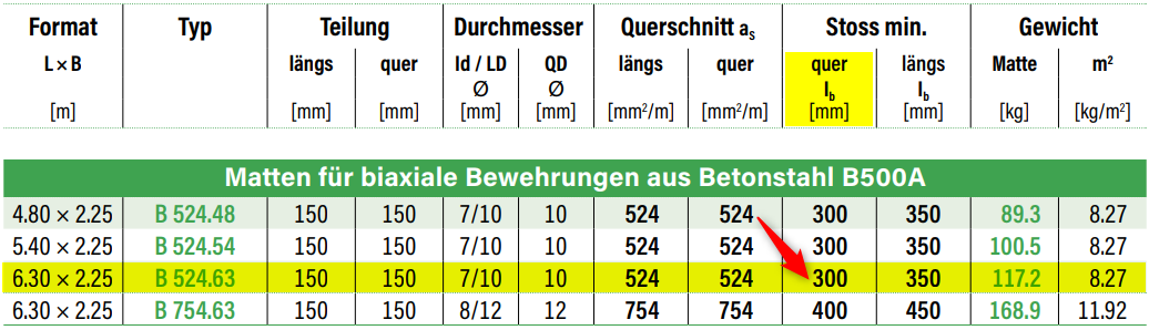 Der Mattentyp B 524.63 wird mit einem Querstoss von 300 mm verlegt: