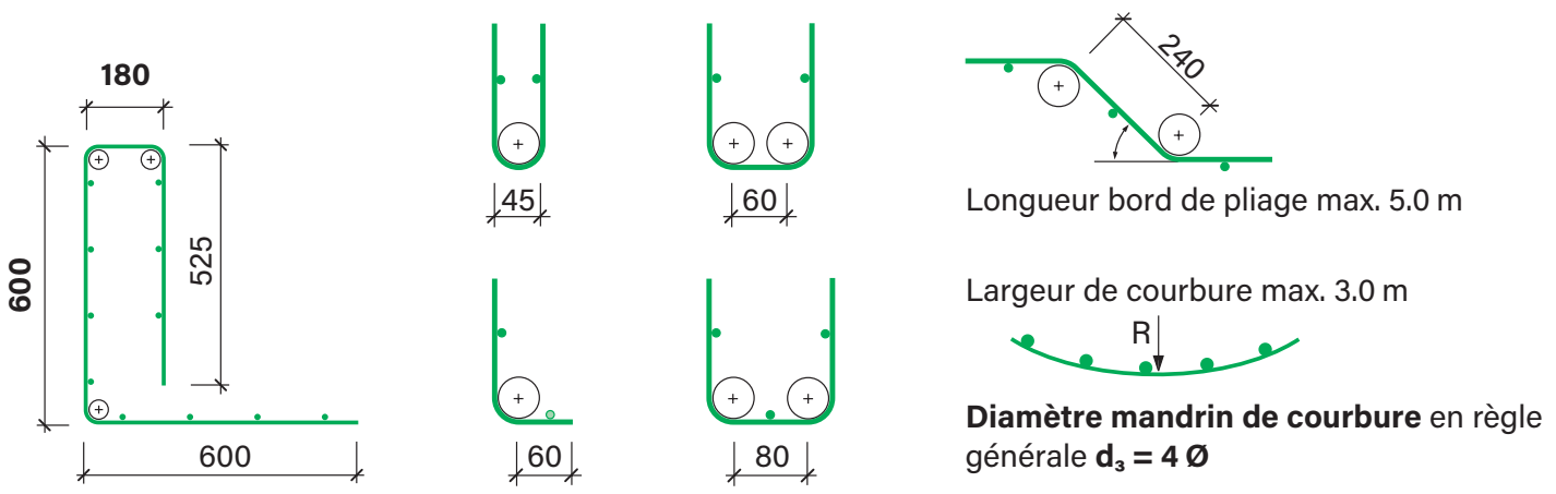 En règle générale, les treillis sont pliés avec un diamètre de mandrin de d3 = 4 Ø, sauf si le concepteur a donné d’autres indications. Les tolérances de dimensions sont définies dans la norme SIA 262:2013.
